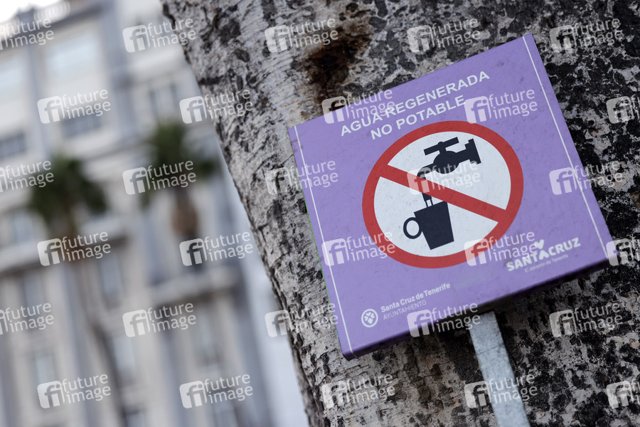 Ein Hinweisschild an einer Palme an der Promenade von Santa Cruz de Tenerife klärt Passanten darüber auf, dass es sich bei dem Wasseranschluss um wiederaufbereitetes und nicht trinkbares Wasser handelt. Wasser ist auf den kanarischen Inseln ohnehin ein knappes Gut. Santa Cruz de Tenerife, 24.11.2021