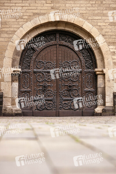 Tor, Holztor, Kirche, Romanik, schmiedeeiserne Beschläge, Torbeschlag, Torband, Torknauf, Torbeschläge, Kirchengrund, Torbänder, Handwerk, Handwerkskunst, Verzierung, Verzierungen, Symbolik, Tradition, Symbolbild, Symbolfoto