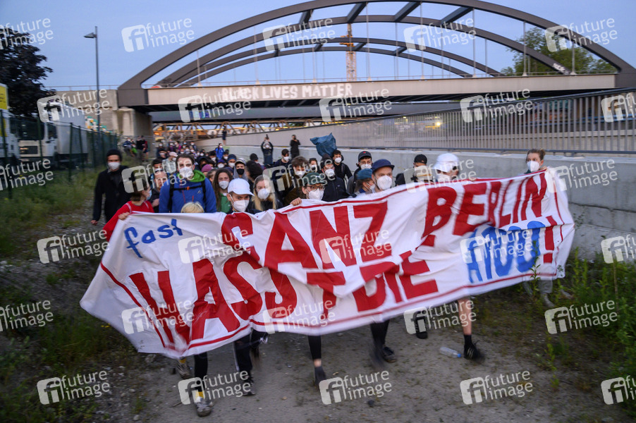 In den frühen Morgenstunden besetzen Aktivisten des Klimaschutzbündnis 'Sand im Getriebe' und 'Ende Gelände' im Rahmen des bundesweiten Anti-Autobahn-Aktionstages zwei Teile der Baustelle der zukünftigen Verlängerung der Stadtautobahn A100. Berlin, 05.06.2021