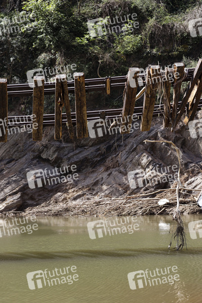 Nach dem Jahrhunderthochwasser in der Eifel durch heftige Regenfälle und Dauerregen mit Überschwemmungen und Überflutungen haben die Aufräumarbeiten im Ahrtal große Fortschritte gemacht. Einheiten von Polizei, THW, Bundeswehr und Feuerwehr mitsamt vielen freiwilligen Helfern haben Straßen geräumt, Schutt und Schlamm entfernt und die Menschen versorgt. Der Wiederaufbau wird trotzdem Jahre dauern. Im Bild Flutschäden an einer Eisenbahnbrücke nahe der Ortschaft Rech, in der die Flut viele Häuser zerstörte, 30.07.2021