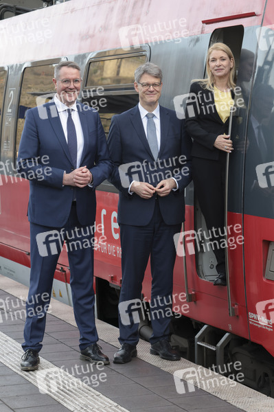Alexander Schweitzer, Patrick Schnieder, Evelyn Palla bei der Inbetriebnahme der neuen Ahrtalbahn mit Sonderfahrt von Dernau nach Altenahr. Altenahr, 12.12.2025