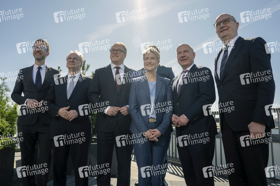 Markus Franke, Reiner Haseloff, Mario Voigt, Carsten Schneider, Manuela Schwesig, Kai Wegner und Dietmar Woidke bei der 53. Regionalkonferenz der Regierungschefin und der Regierungschefs der ostdeutschen Länder, der MPK-Ost, in der Vertretung des Freistaates Thüringen beim Bund. Berlin, 03.04.2025