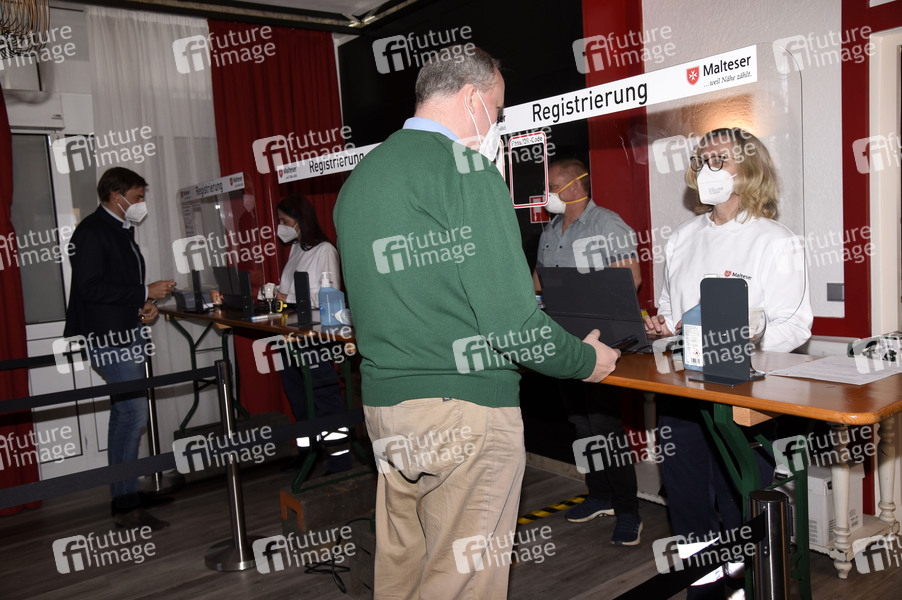Bürgermeister Maximilian Böltl und Landrat Christoph Göbel bei der Eröffnung eines neuen Schnelltestzentrums im Hotel Dormero. Kirchheim, 30.03.2021