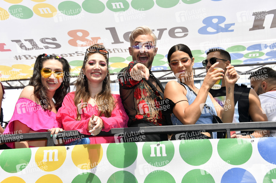 Kaye Katcher mit Gästen auf dem M&M's Truck bei der 44. Christopher Street Day Parade 2022 unter dem Motto 'United in Love! Gegen Hass, Krieg und Diskriminierung' vom Spittelmarkt auf gut sieben Kilometern über Potsdamer Platz und Potsdamer Straße zum Nollendorfplatz, von dort weiter zur Siegessäule und zum Brandenburger Tor. Berlin, 23.07.2022