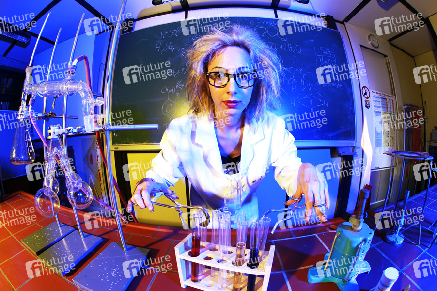 Model-Shooting zum Thema Chemie für das Cover des SOLsnap Magazins im Chemieraum einer Schule. Hameln, 25.05.2013