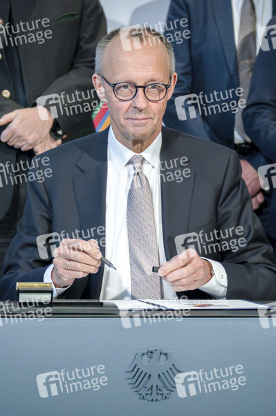 Friedrich Merz bei der Unterzeichnung der Vereinbarung zur Olympiabewerbung im Bundeskanzleramt. 04.12.2025