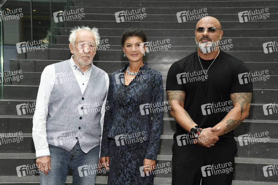 Dieter Hallervorden, Sahra Wagenknecht und Massiv bei der Pressekonferenz zur Friedenskundgebung am 13. September im Tagungszentrum im Haus der Bundespressekonferenz. Berlin, 08.09.2025