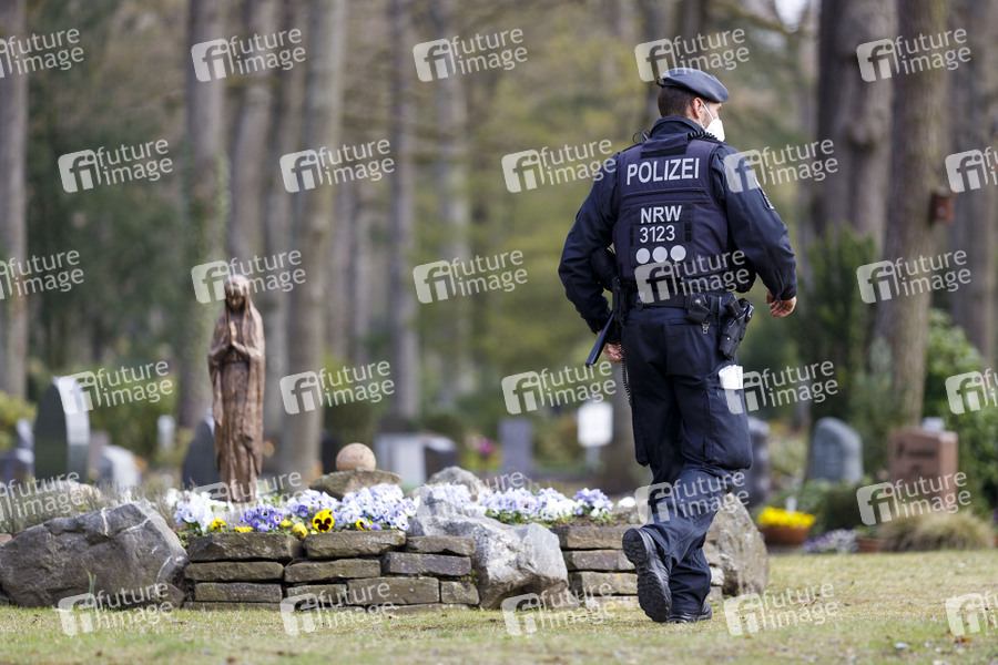 Die Stadt Leverkusen befürchtete eine größere Menschenansammlung bei der Beerdigung eines hochrangigen Clan-Mitglieds einer Großfamilie und damit Verstöße gegen die Corona-Schutzverordnung. Polizisten begehen das Gelände des Friedhof Reuschenberg vor der Beerdigung. Leverkusen, 09.04.2021