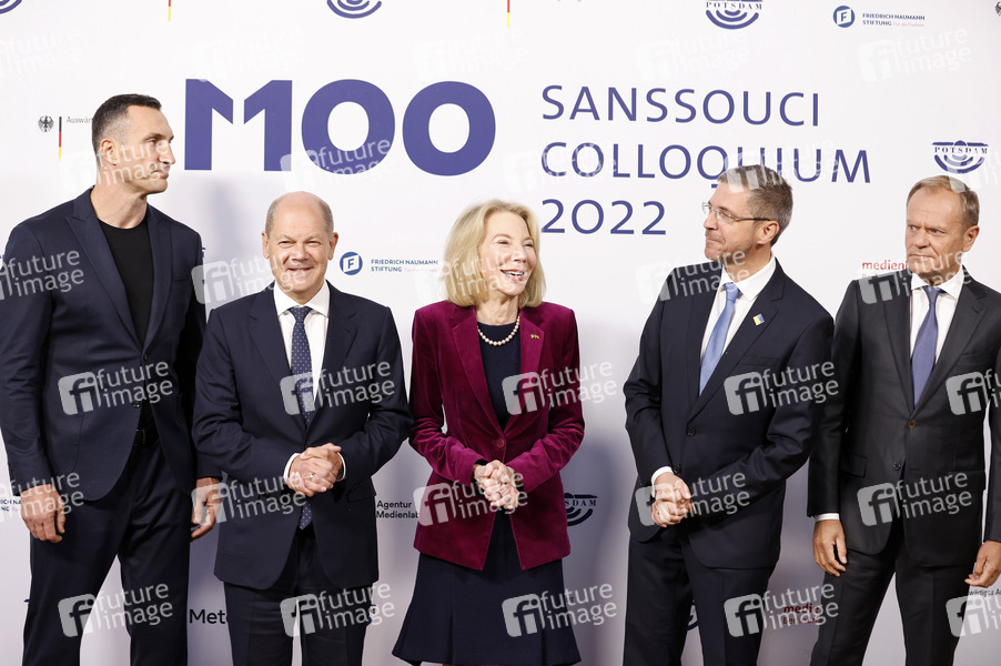 Wladimir Klitschko, Olaf Scholz, Amy Gutmann, Mike Schubert und Donald Tusk bei der Verleihung des M100 Media Award 2022 für das ukrainische Volk in der Orangerie Sanssouci. Potsdam, 15.09.2022