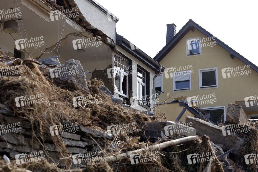 Nach dem Jahrhunderthochwasser in der Eifel durch heftige Regenfälle und Dauerregen mit Überschwemmungen und Überflutungen haben die Aufräumarbeiten im Ahrtal begonnen. Einheiten von Polizei, THW, Bundeswehr und Feuerwehr mitsamt vielen freiwilligen Helfern räumen Straßen, entfernen Schutt und Schlamm und versorgen die Menschen. Im Bild zerstörte Häuser in der Ortschaft Altenahr, in der die Flut viele Häuser zerstörte, 22.07.2021