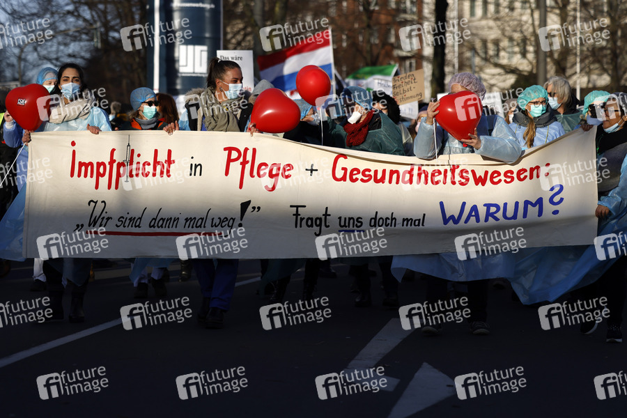 Bei einer angemeldeten Demo unter dem Motto 'Wir alle gemeinsam - Freie Impfentscheidung' demonstrierten etwa 12.000 Gegner einer Impfpflicht mit einem Spaziergang gegen die Corona-Maßnahmen der Bundesregierung und für eine individuelle Impfentscheidung, Grundrechte und 'unversehrte' Kinder - darunter auch viele Pflegekräfte, die wegen der Impfpflicht im Gesundheitsbereich ihren Job zu verlieren drohen. Düsseldorf, 12.02.2022