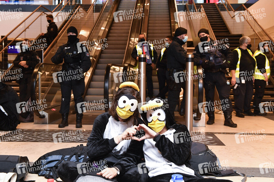 Klimaaktivisten der Aktionsgruppe 'Am Boden bleiben' protestieren gegen die Eröffnung des Flughafens Berlin-Brandenburg (BER). Schönefeld, 31.10.2020