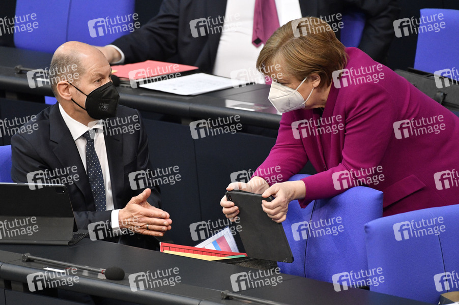 Olaf Scholz und Angela Merkel in der 218. Sitzung des Deutschen Bundestages im Reichstagsgebäude. Berlin, 25.03.2021