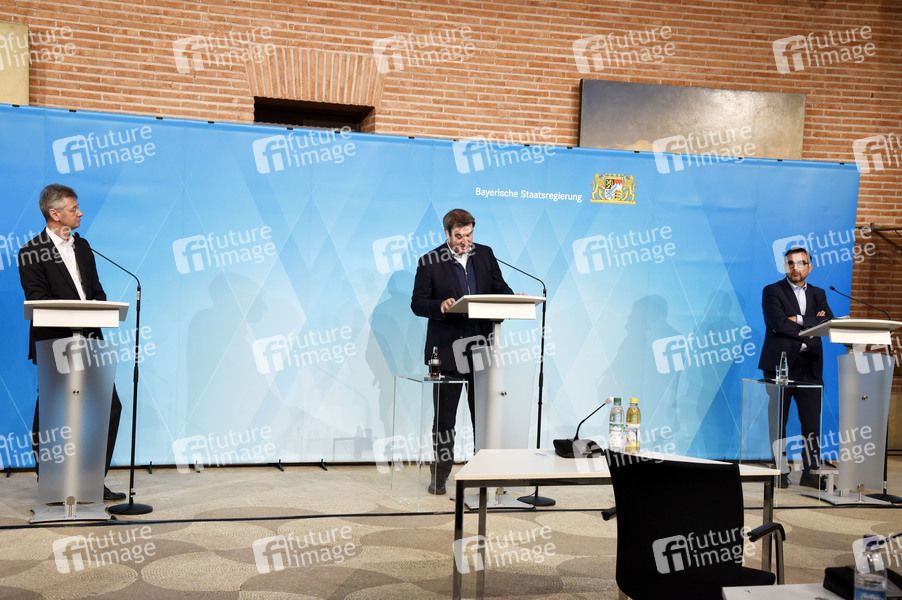Pressekonferenz, PK, Corona-Pandemie, Sars-CoV-2, Covid-19, Coronavirus, Coronaviren, Corona-Virus, Coronakrise, Corona-Krise, Corona-Pandemie, Coronamaßnahmen, Maßnahmen, Ansteckung, Ansteckungsgefahr, Epidemie, Pandemie, Coronaregeln, Corona-Regeln, Corona-Schutz, Corona-Schutzmaßnahmen, Lock-Down, Lockdown, Politiker, Bayerischer Staatsminister für Unterricht und Kultus, Ministerpräsident von Bayern, Vorsitzender der CSU, Staatssekretär für Gesundheit und Pflege