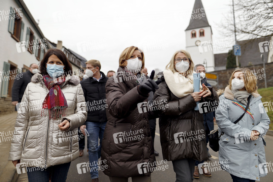 Daniela Schmitt, Malu Dreyer und Katrin Eder besuchen sechs Monate nach der Jahrhundertflut das Ahrtal, um Bestandsaufnahme in der Ortsgemeinde Schuld zu machen. Schuld, 12.01.2022