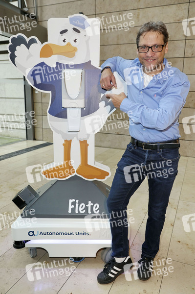 Patrick Bach beim Fototermin mit Service-Roboter 'Fiete', einem mobilen Spender für Hand-Desinfektionsmittel der Firma Autonomous Units, in der Europa Passage, Hamburg, 28.11.2022