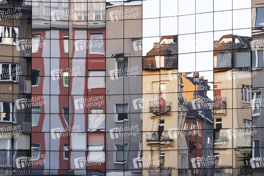 Wohnhäuser in der Kölner Innenstadt spiegeln sich in einer Glasfassade. Köln, 29.07.2020
