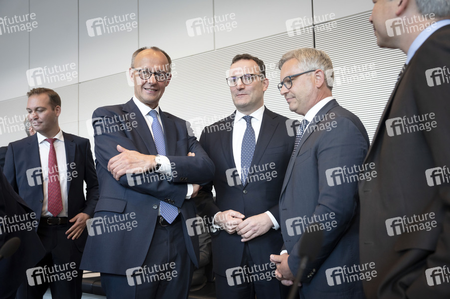 Friedrich Merz und Jens Spahn bei der Fraktionssitzung der CDU/CSU-Bundestagsfraktion im Reichstagsgebäude. Berlin, 20.05.2025