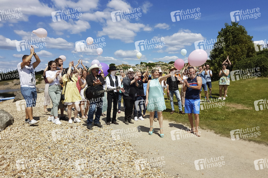 Linda Feller und Ehemann Andreas Schmid beim MyTVplus Videodreh zur Single 'Ab jetzt' mit den Gaststars Hartmut 'Muck' Schulze-Gerlach, Ernst Dollwetzel und Truck Stop im Lausitzer Findlingspark. Boxberg, 13.07.2020