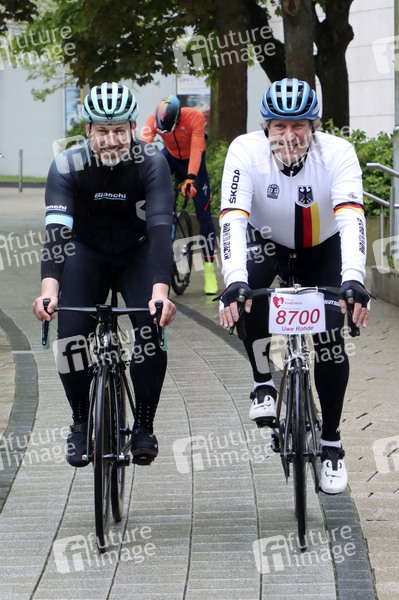 Björn Schröder und Uwe Rohde beim Start der HerzRadtour zugunsten der Stiftung KinderHerz vor dem Alstertal-Einkaufszentrum. Hamburg, 26.05.2021