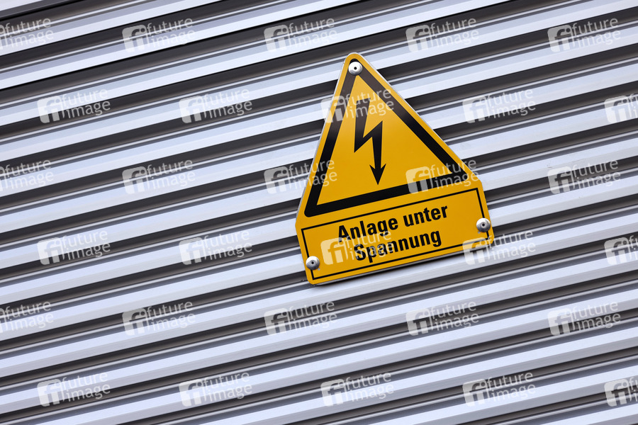Ein Warnhinweis 'Anlage unter Spannung' an einem Stromkasten. (Symbolbild, Themenbild) Köln, 11.05.2021