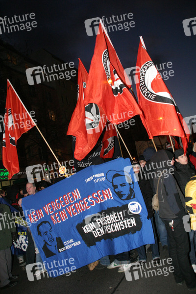 Antifa Demo (Antifaschistische Aktion) in der Berliner Samariterstrasse. Vor 15 Jahren wurden der junge Hausbesetzer und Antifaschist Silvio Meier auf dem U-Bahnhof Samariterstraße bei einem Überfall von Neonazis getötet