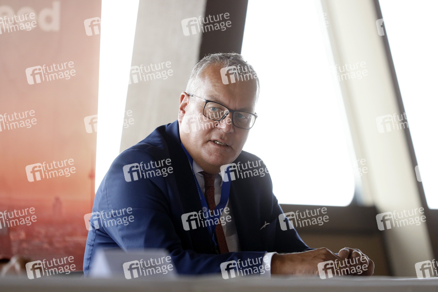 Dieter Steinkamp bei der Unterzeichnung der Vereinbarung für ein zukunftssicheres 5G-Netz in Köln auf dem Fernsehturm Colonius. Köln, 09.09.2020