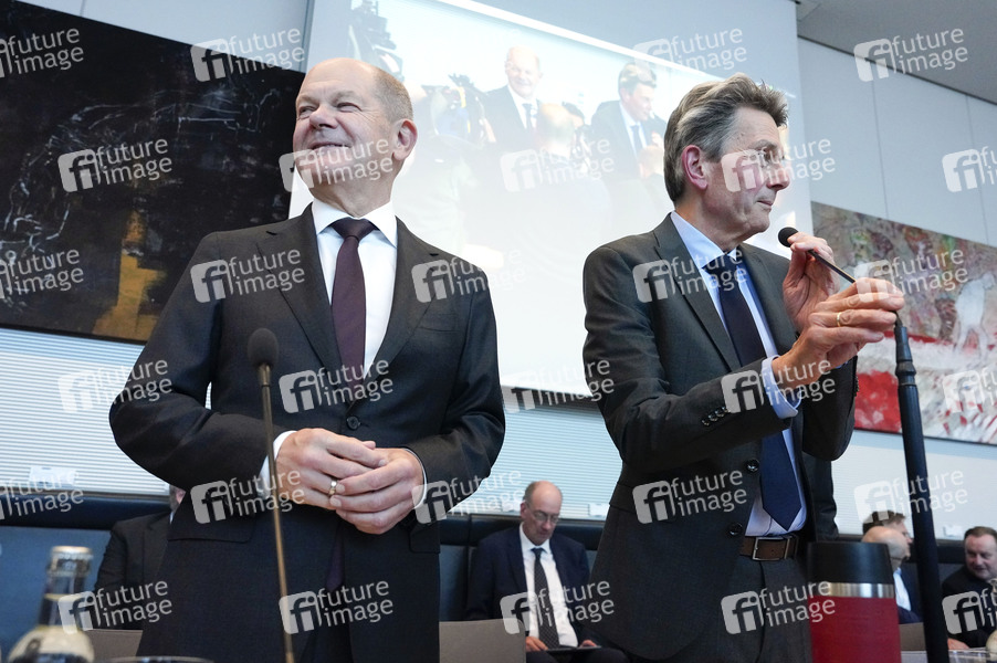 Olaf Scholz und Rolf Mützenich bei der Fraktionssitzung der SPD-Bundestagsfraktion im Reichstagsgebäude. Berlin, 08.10.2024