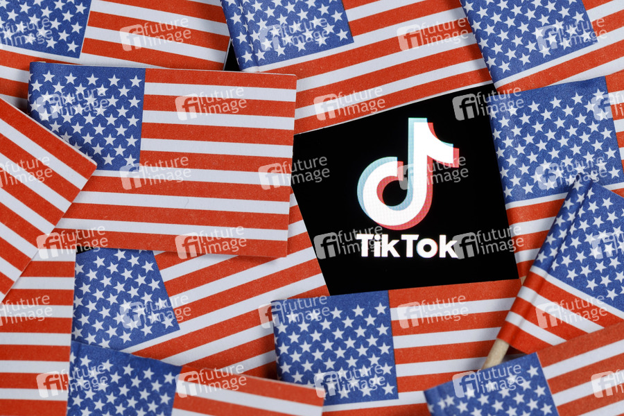 Das Logo der Video-App Tiktok auf einem Bildschirm umringt von US-Flaggen. Ein Richter hat Donald Trumps TikTok-Verbot für unwirksam erklärt. (Symbolfoto, Themenfoto)