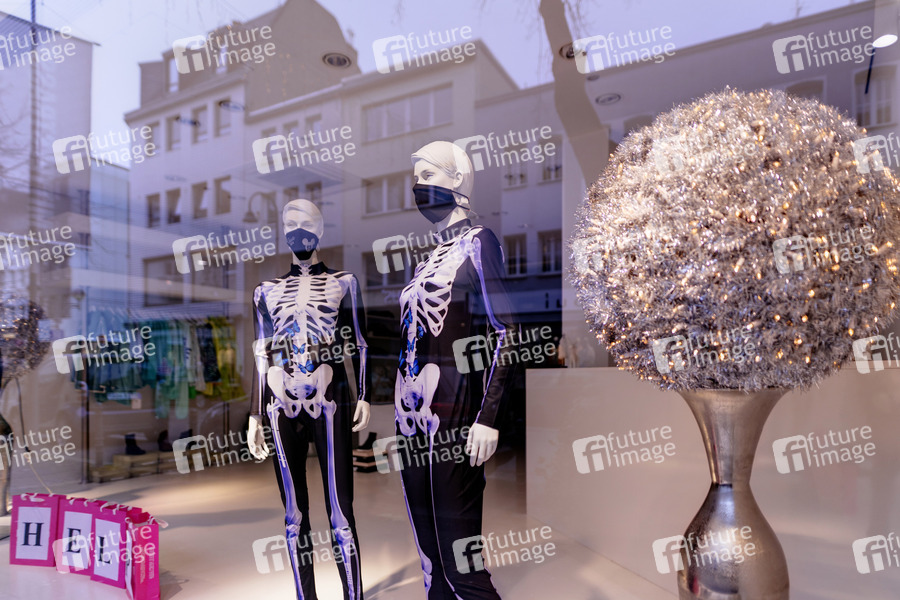 Einzelhändler auf der exklusiven Kölner Mittelstraße haben aus Protest gegen die Corona-Maßnahmen des Bundes, die sie zum Lockdown zwingen, Schaufensterpuppen zu Skeletten umgestaltet und mit Gesichtsmasken versehen. Sie fordern eine gerechtere Verteilung der Corona-Hilfspakete, eine sinnvollere Corona-Politik wie etwa eine stärkere Steuerentlastungen für den Einzelhandel oder eine Mietpreisbremse für Einzelhandelsgeschäfte. (Themenbild, Symbolbild) Köln, 11.01.2021