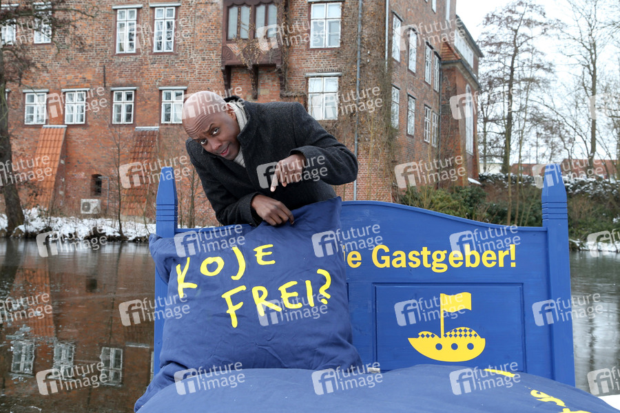 Yared Dibaba paddelt auf dem Schloßteich für die Aktion 'Koje frei?' um für Unterkünfte für Teinehmer der Kirchentags zu werben. Winsen an der Luhe, 13.03.2013