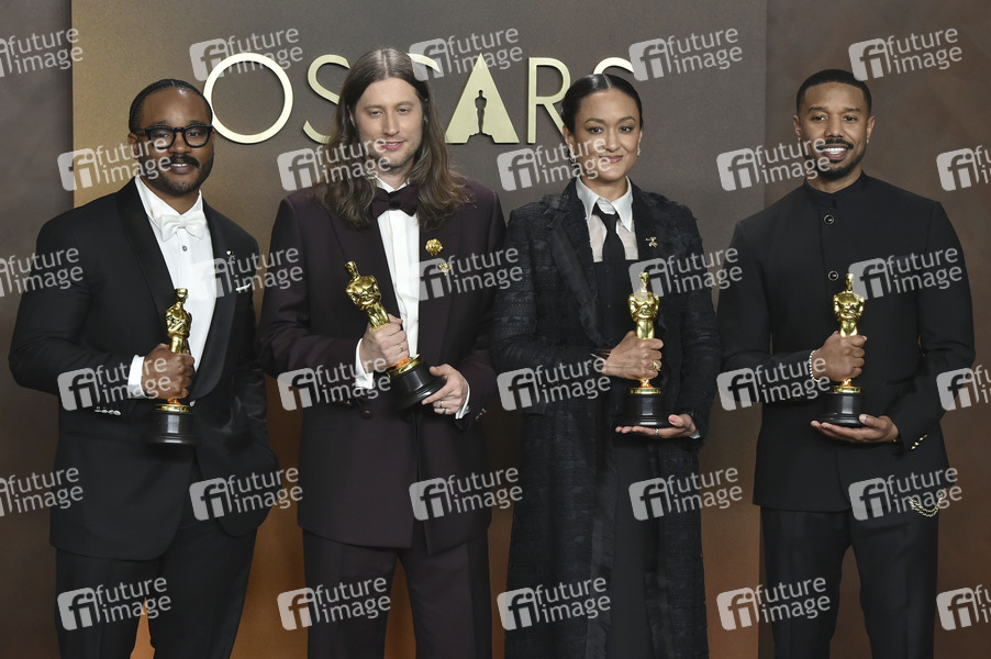 Ryan Coogler mit dem Oscar für das beste Drehbuch, Ludwig Göransson mit dem Oscar für den besten Soundtrack, Autumn Durald Arkapaw mit dem Oscar für die besten Kamera und Michael B. Jordan mit dem Oscar für den besten Hauptdarsteller in 'Blodd & Sinners' beim Preisträger-Photocall der Oscar Verleihung 2026 / 98th Annual Academy Awards im Dolby Theatre. Los Angeles, 15.03.2026