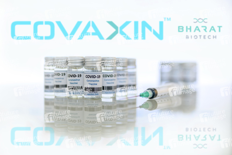 Impfdosen und Impfspritzen stehen auf einem Tisch vor dem Logo von Covaxin und dem Logo von Bharat Biotech. (Themenbild, Symbolbild)