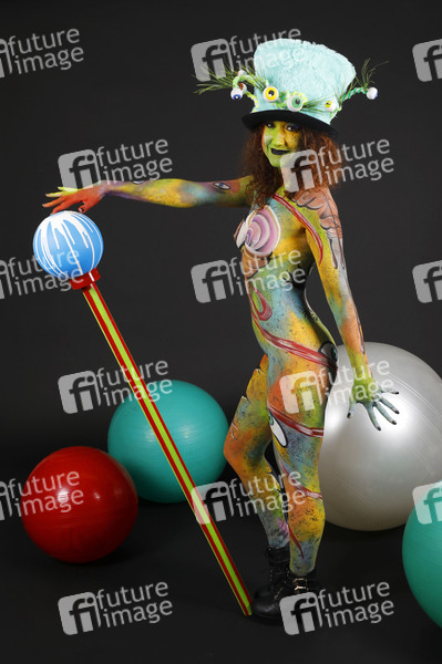 Das World Bodypaiting Festival 2020 fand aufgrund der Corona-Pandemie online statt. Unter dem vorgegebenen Motto 'Psychedelic Circus' verwandelte BodyArt-Künstler Jörg Düsterwald sein Model Lena in einen psychedelischen Mad Hatter. Hameln, 10.07.2020
