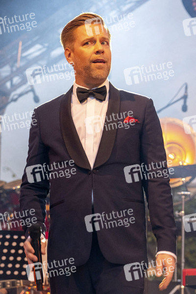 Tom Gaebel mit der Lumberjack Swing-Band unter der Leitung von Alexander Eissele live bei einem Konzert auf Schloss Filseck. Uhingen, 13.07.2024