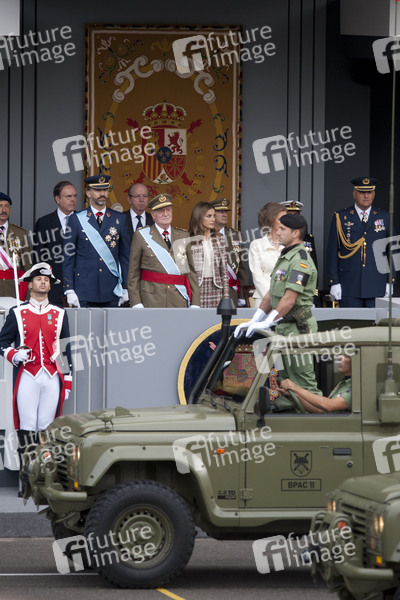 Die spanische Königsfamilie bei der Hommage an die Nationalflagge mit Militärparade am Palacio Real, Madrid