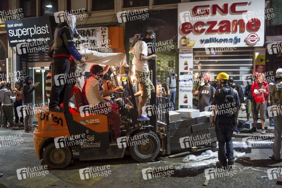 Barrikaden werden gebaut. Proteste nahe dem Taksim Platz und im Gezi-Park in Istanbul. Türkei, 16.06.2013