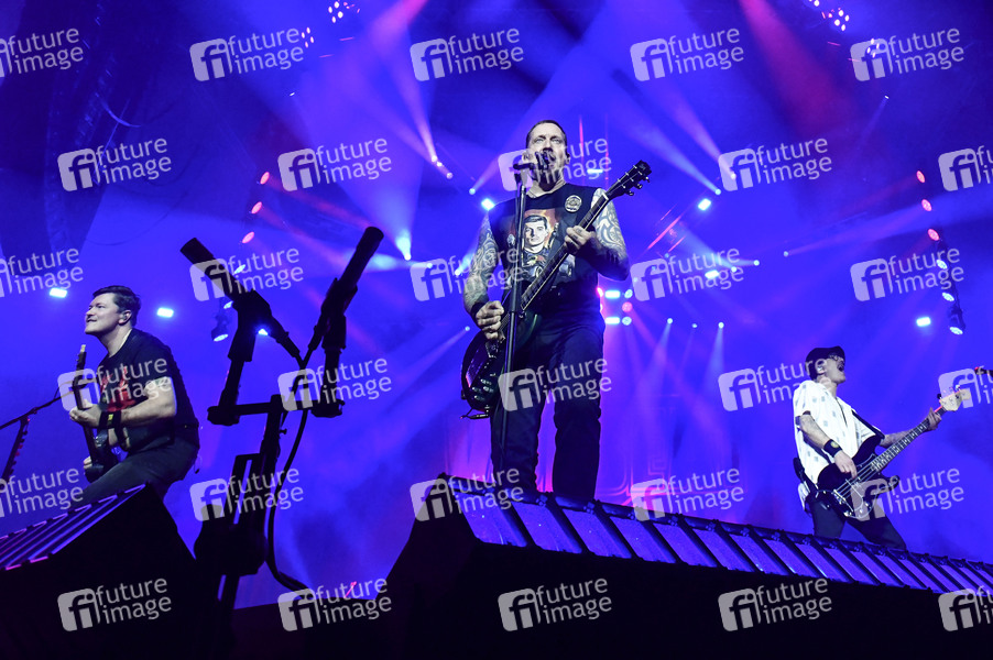 Flemming C. Lund, Michael Poulsen und Kaspar Boye Larsen von Volbeat live bei einem Konzert der 'Greatest of all Tours Worldwide' in der ZAG Arena. Hannover, 21.10.2025
