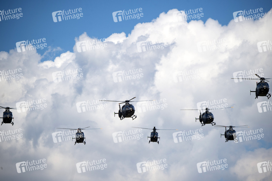 Militärhubschrauber bei der Zeremonie der Übergabe der Nationalflagge an die ACAVIET (Luftfahrtakademie der Armee) in der Helipuerto Base Coronel Mate. Colmenar Viejo, 07.05.2021