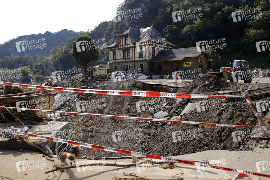 Nach dem Jahrhunderthochwasser in der Eifel durch heftige Regenfälle und Dauerregen mit Überschwemmungen und Überflutungen haben die Aufräumarbeiten im Ahrtal begonnen. Einheiten von Polizei, THW, Bundeswehr und Feuerwehr mitsamt vielen freiwilligen Helfern räumen Straßen, entfernen Schutt und Schlamm und versorgen die Menschen. Im Bild zerstörte Häuser in der Ortschaft Altenahr, in der die Flut viele Häuser zerstörte, 22.07.2021