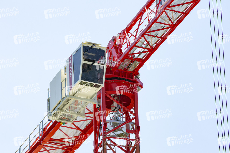 Kran, Turmkran, Turmkräne, Hebemaschine, Turmdrehkran, Obendreherkran, Krantechnik, Kranvermietung, Kranzubehör, Baukanhandel, Krananstrich, Kranfarbe, Baustelle, Hochbau, Hochbaukrane, Tiefbau, Fachwerkträger, Drehkranz, Vorderer Auslager, hinterer Ausleger, Katzausleger, Nadelausleger, Turmkrankonstruktion, Wolffkran, Baumaschinen, Baumaschienenhersteller, Kranhersteller, Turmspitze, Ballastgewicht, Gegenausleger, Traglast, Widerlager, Aufstellfläche, Bodenplatte, Betongewichte, Stahlrohrkonstruktion, Lastmoment, Krankomponenten, Fundamentanker, Turmabspannung, Innenkletterleiter, Kranfahrer, Kranführer, Krankanzel, Steuerkanzel, Wirtschaft, Bau, Symbolbild, Symbolfoto
