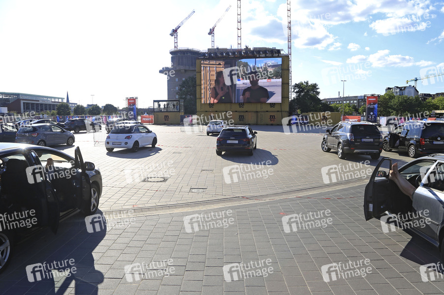 Zuschauer bei der Aufführung des Films 'Tschick' im Autokino Bewegte Zeiten auf dem Heiligengeistfeld. Hamburg, 21.6.2020