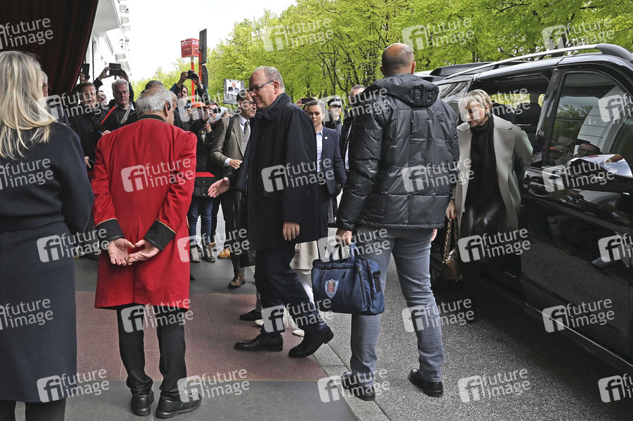 Fürst Albert II. von Monaco mit Fürstin Charlene bei ihrer Ankunft im Hotel Vier Jahreszeiten. Die Fürstenfamilie ist zur Eröffnung des Monaco-Abschnitts im Miniatur Wunderland nach Hamburg gekommen. Hamburg, 25.04.2024
