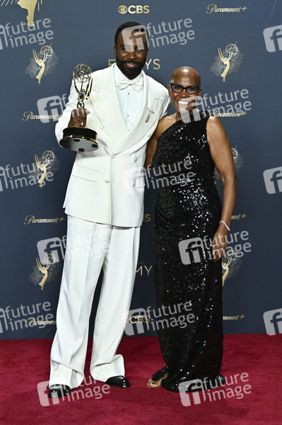 Tramell Tillman mit dem Emmy für den besten Nebendarsteller in der Drama-Serie 'Severance' und seiner Mutter beim Preisträger-Photocall der 77. Primetime Emmy Awards 2025 im Peacock Theater. Los Angeles, 14.09.2025