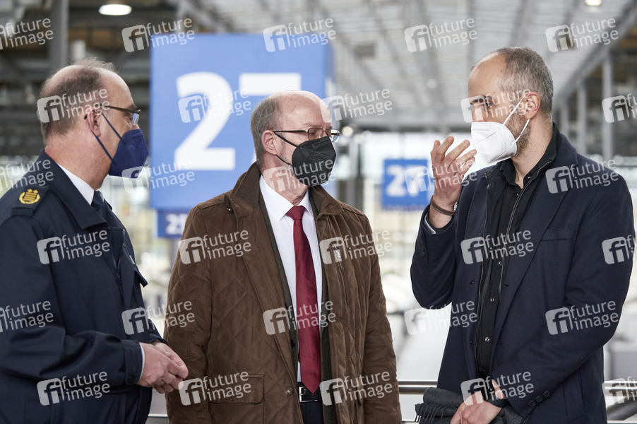 Dieter Rohrberg (Leiter der Feuerwehr Hannover), Volker Kluwe (Polizeipräsident der Polizeidirektion Hannover) und Belit Onay (Oberbürgermeister der Landeshauptstadt Hannover) - Zeltdörfer-Unterkünfte für ukrainische Kriegsflüchtlinge in der Halle 27 auf dem Messegelände, inklusive Wasch- und Duschmöglichkeiten, errichtet von der Feuerwehr Hannover. Die spätere Versorgung erfolgt durch das DRK. Hannover, 06.03.2022