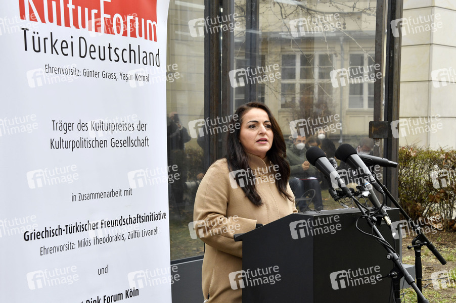 Sevim Dagdelen bei der Pressekonferenz des KulturForum TürkeiDeutschland zur Solidarität mit den gesamten demokratischen Kräften in der Türkei, insbesondere mit inhaftierten Schriftsteller*innen, Künstler*innen, Journalist*innen, Gewerkschafter*innen und Politiker*innen vor dem Maxim Gorki Theater. Berlin, 23.03.2021
