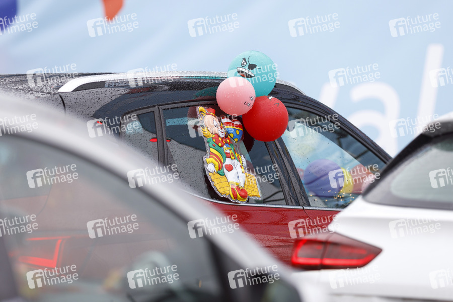 Impression beim Autokonzert 'Carnevalssitzung #1' von Bonnlive am Südstadion. Wegen der anhaltenden Coronakrise sind Karnevalsveranstaltungen in diesem Jahr weitgehend abgesagt, der Kölner Rosenmontagszug findet lediglich virtuell statt, Konzerte unterliegen strengen Beschränkungen. Köln, 06.02.2021