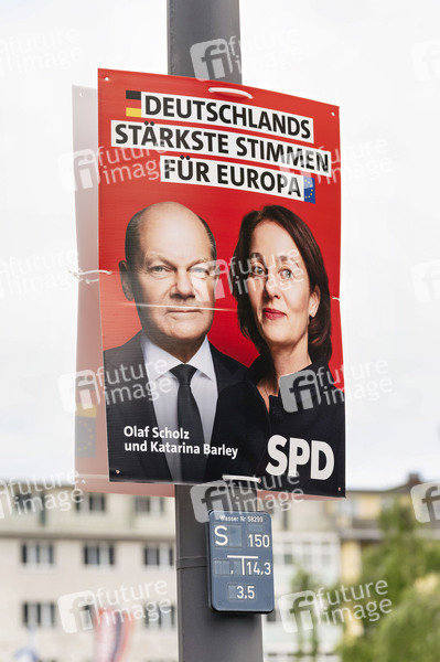 Ein Plakat der Partei SPD zur Europawahl. Vom 6. bis 9. Juni 2024 wählen die Bürgerinnen und Bürger der Europäischen Union (EU) zum zehnten Mal das Europäische Parlament. In Deutschland wird am Sonntag, 9. Juni 2024 gewählt. Berlin, 21.04.2024