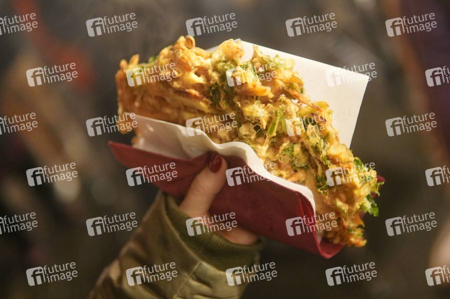 Koreanisches frittiertes Gemüse im Teig auf dem Alt-Rixdorfer Weihnachtsmarkt rund um den Neuköllner Richardplatz. Berlin, 08.12.2024