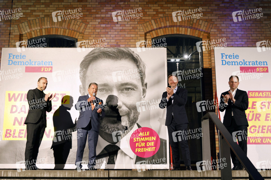 Sebastian Czaja, Jörg Woltmann, Christian Lindner und Christoph Meyer beim Wahlkampfabschluss der FDP für die Bundestagswahl 2021 in der KPM Königlichen Porzellan-Manufaktur. Berlin, 24.09.2021